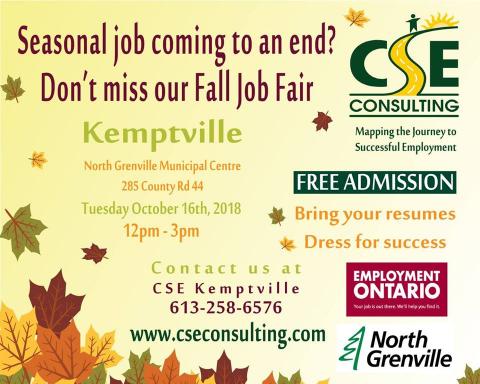 Meet with different Employers and Apply for Local Jobs at our Fall Job Fair in North Grenville. A list of Employers will be posted soon. For more details please contact our CSE Kemptville Office: 125 Prescott St, 613-258-6576