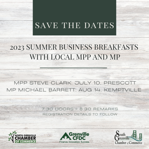Please join the North and South Grenville Chambers of Commerce and Grenville CFDC for our series of two business breakfasts this summer.