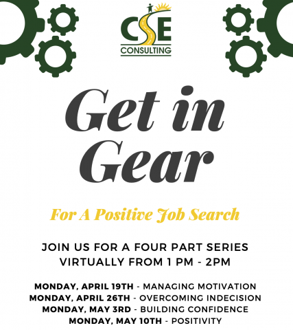CSE Consulting has created a new virtual series for job seekers! Take this opportunity during the stay at home order to Get in Gear with your Job Search with these self improvement workshops. Find the Motivation, Overcome the Indecision, Build your Confidence and Harness that Positive Attitude so that you are ready to enter the job market as the best version of yourself.